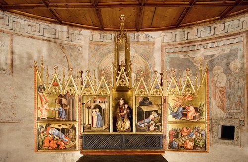 Zu den bekannteste Einrichtungsgegenständen von Schloss Tirol gehört der sogenannte „Altar von Schloss Tirol“. Er ist einer der ältesten erhaltenen Flügelaltäre und wird einer böhmisch geschulten Werkstatt aus Wien zugeschrieben. Das Tafelretabel ist eine Stiftung der Habsburger als neue Landesherren und kam vermutlich im Zuge der Huldigungsreise der Brüder Albrecht III. und Leopold III. von Habsburg – die auch auf den Flügelaußenseiten dargestellt sind – 1370/73 nach Tirol.