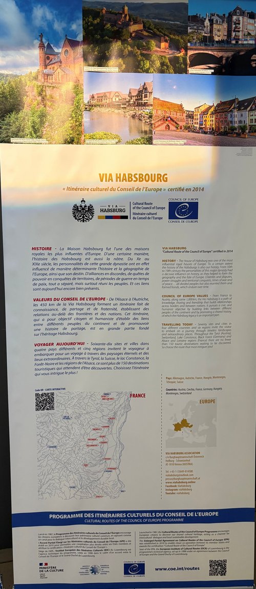 Alsace Destination Tourisme - Pro vertrat die Via Habsburg am 25. und 26. September in Paris im Maison de l'Europe ("Europahaus"), wo Besucher derzeit die neue Wanderausstellung zu den 33 Kulturrouten des Europarates Frankreichs entdecken können. Diese wurde vom französischen Kulturministerium in Zusammenarbeit mit den Routen konzipiert und lädt Reisende dazu ein, Grenzen zu überschreiten, um ihre Geschichte, das Erbe und die Werte Europas im Sinne eines nachhaltigen und sinnvollen Tourismus zu entdecken.